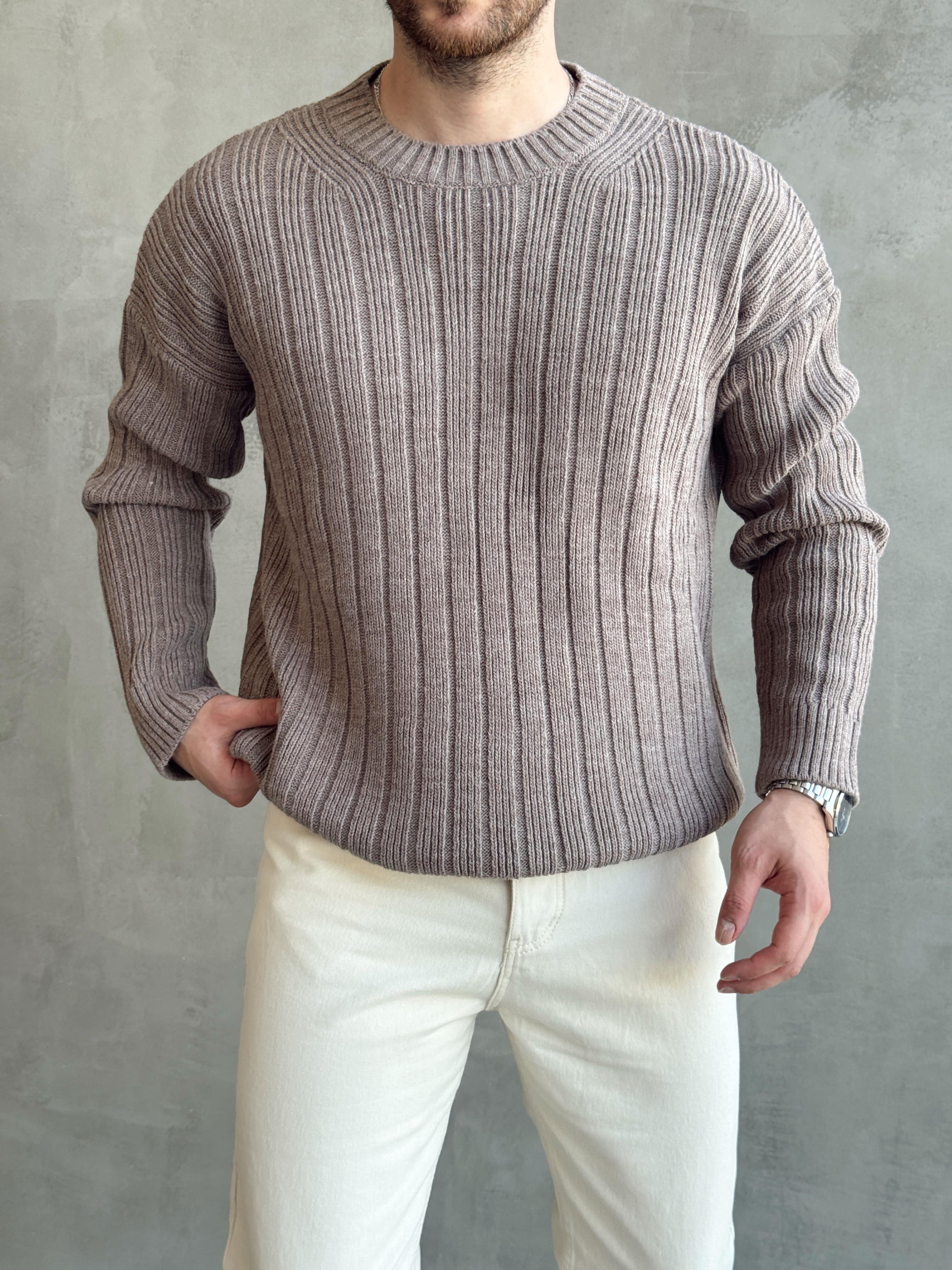Erkek Elit Kalite Oversize Kalıp Bisiklet Yaka Örme Triko Kazak-Vizon(E1483)Ketench