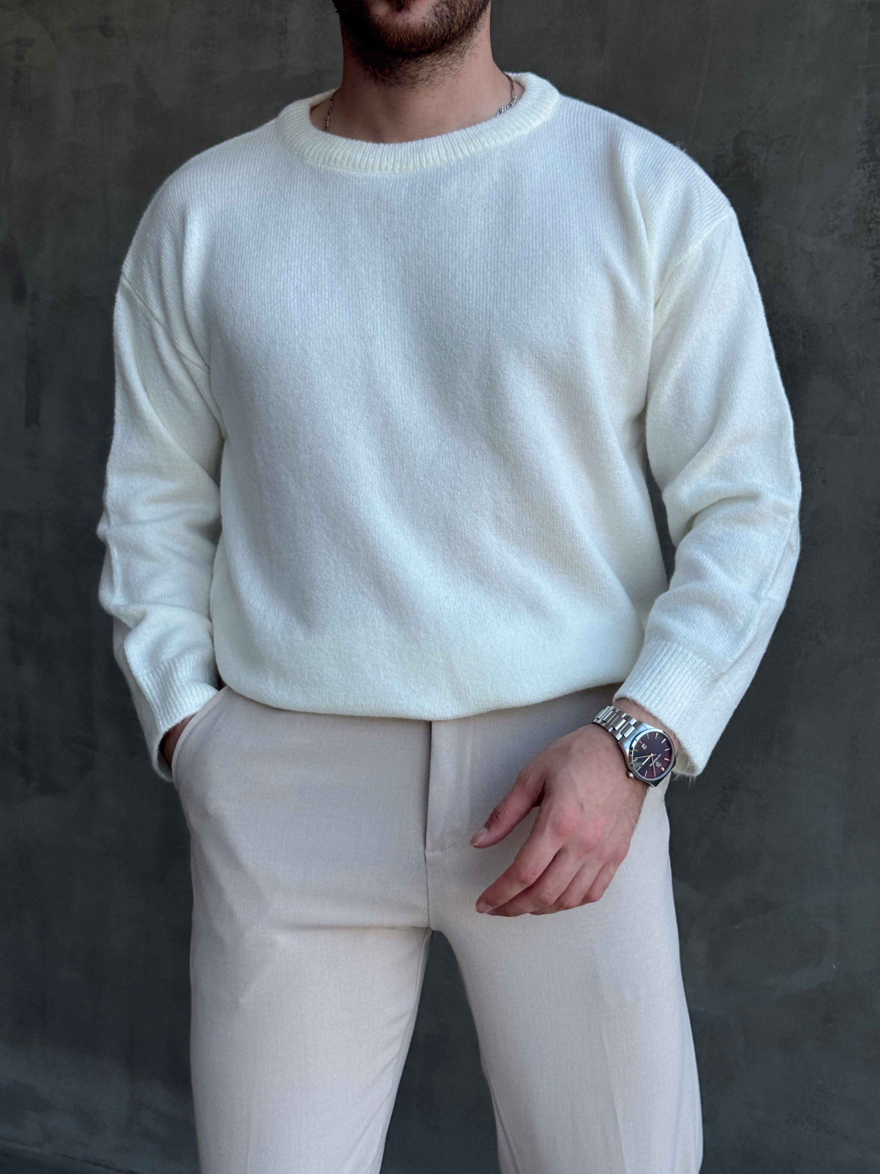 Erkek Elit Kalite Oversize Kalıp Bisiklet Yaka Pamuklu Triko Kazak-Ekru(E1484)
