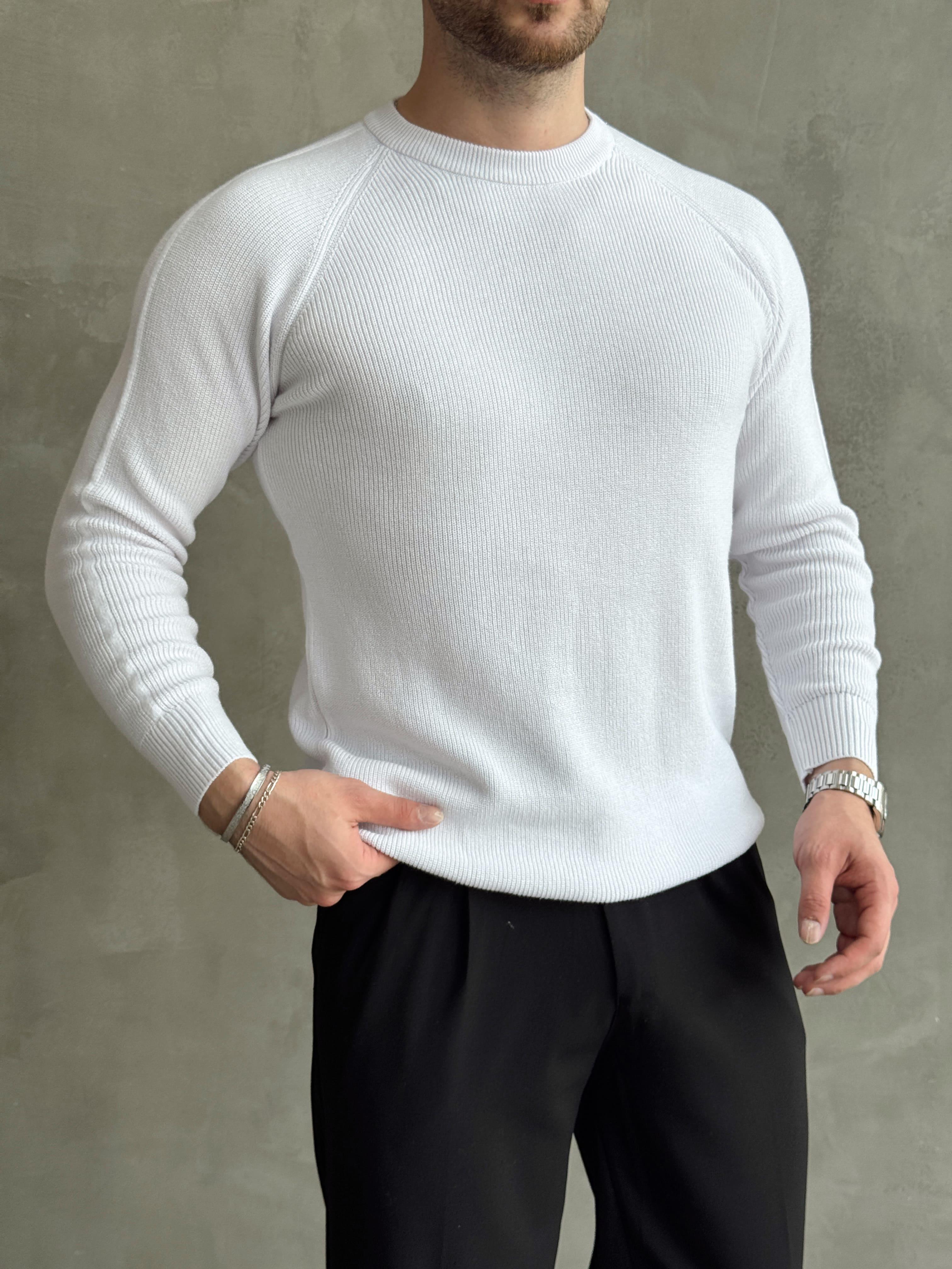 Erkek Elit Saçim Slim Fit Bisiklet Yaka Ribana Detay Dikiş Model Triko Kazak-Beyaz(E1469)