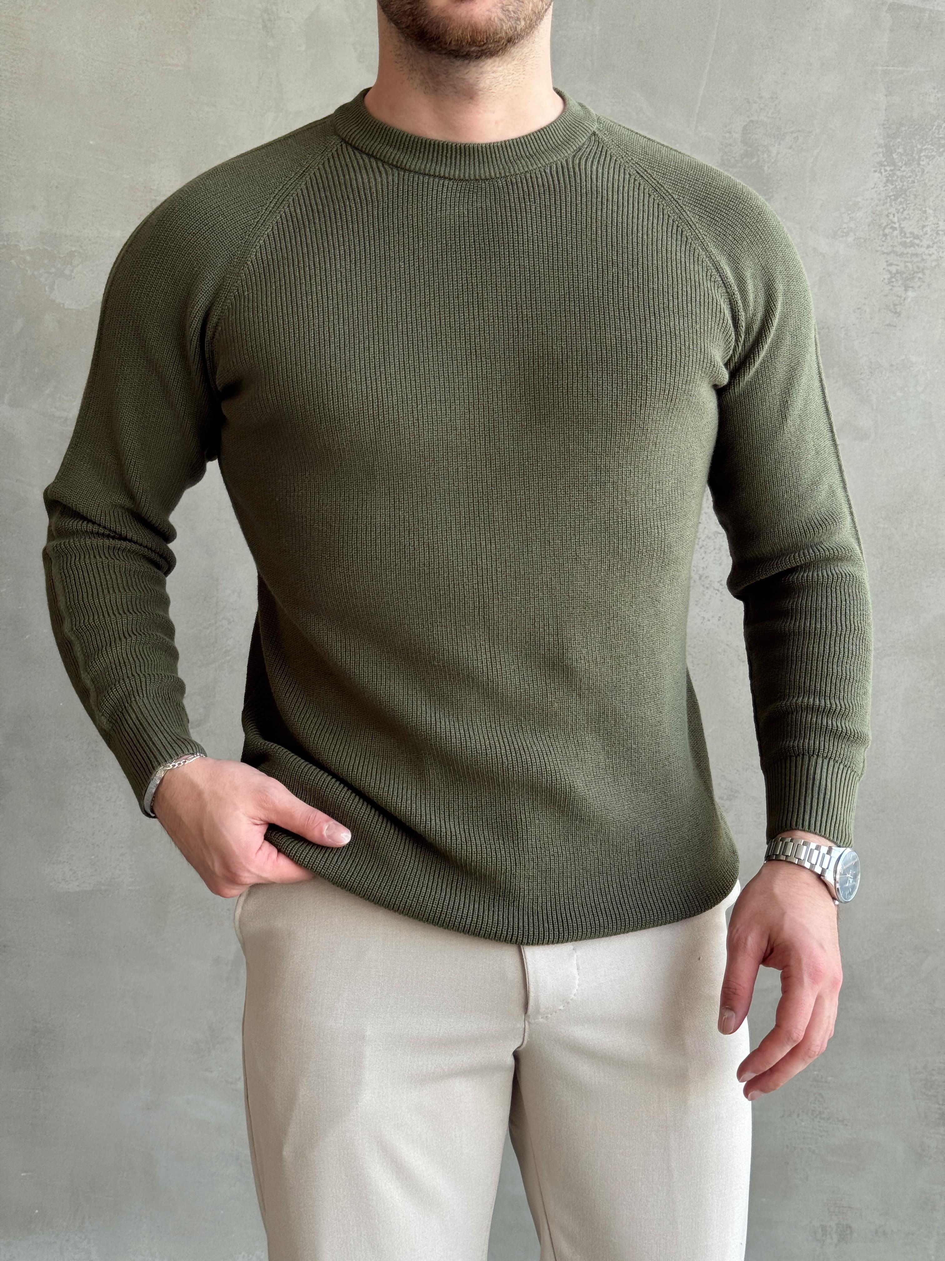 Erkek Elit Saçim Slim Fit Bisiklet Yaka Ribana Detay Dikiş Model Triko Kazak-Haki(E1469)
