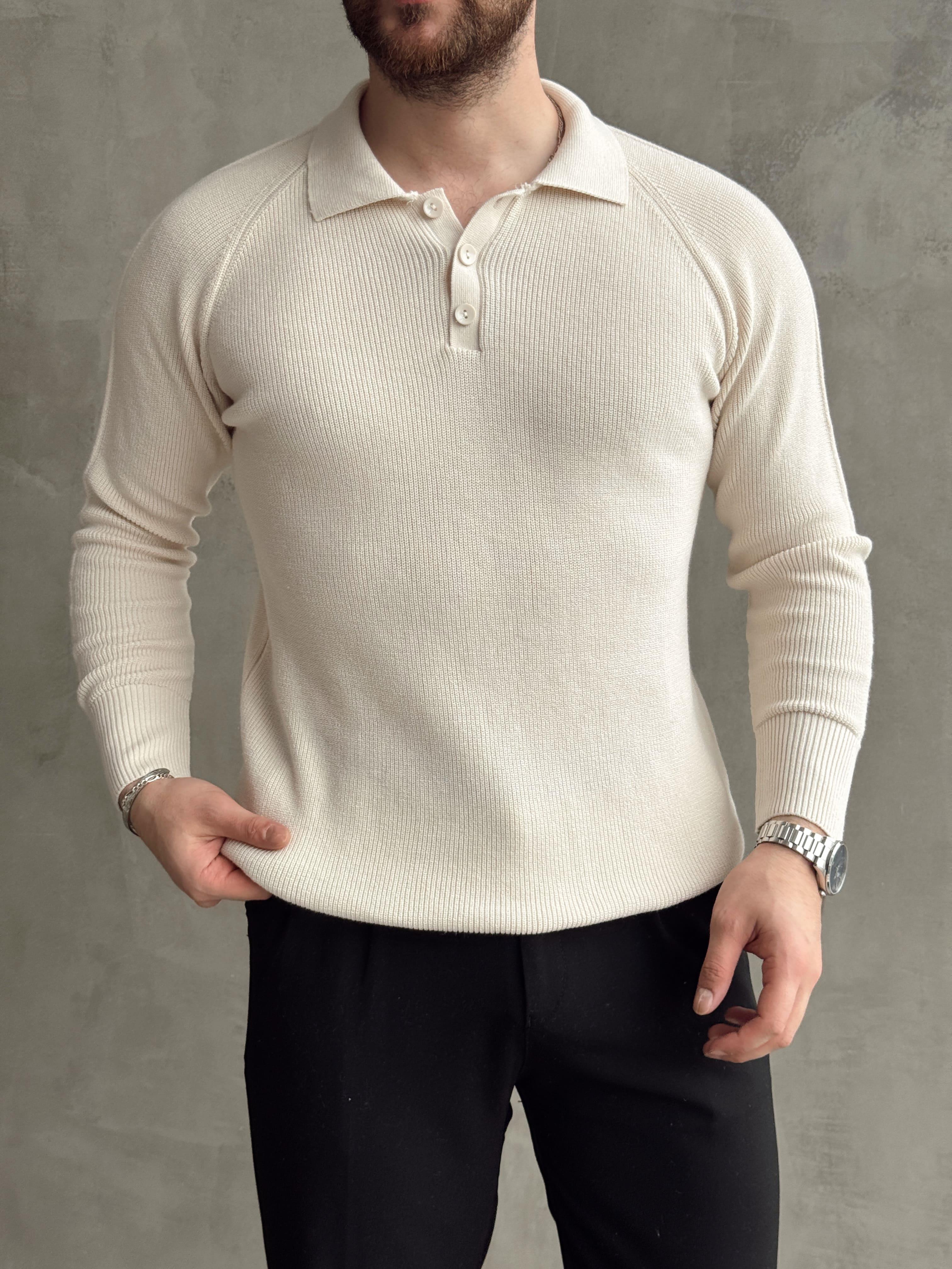 Erkek Elit Tasarım Regular Fit Düğme Detaylı Pola Yaka Triko Kazak-Bej(E1509)Ketench