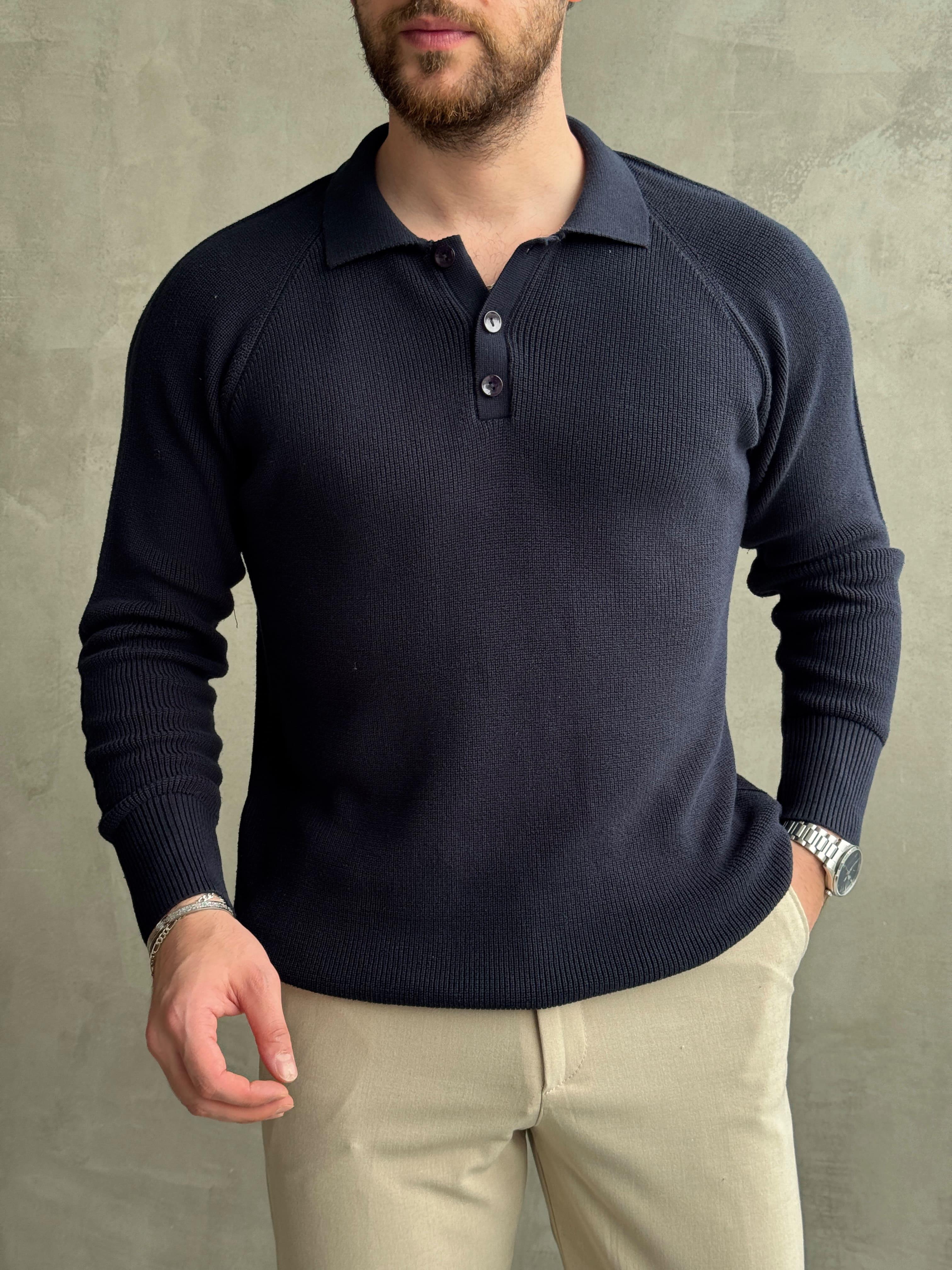 Erkek Elit Tasarım Regular Fit Düğme Detaylı Pola Yaka Triko Kazak-Lacivert(E1509)