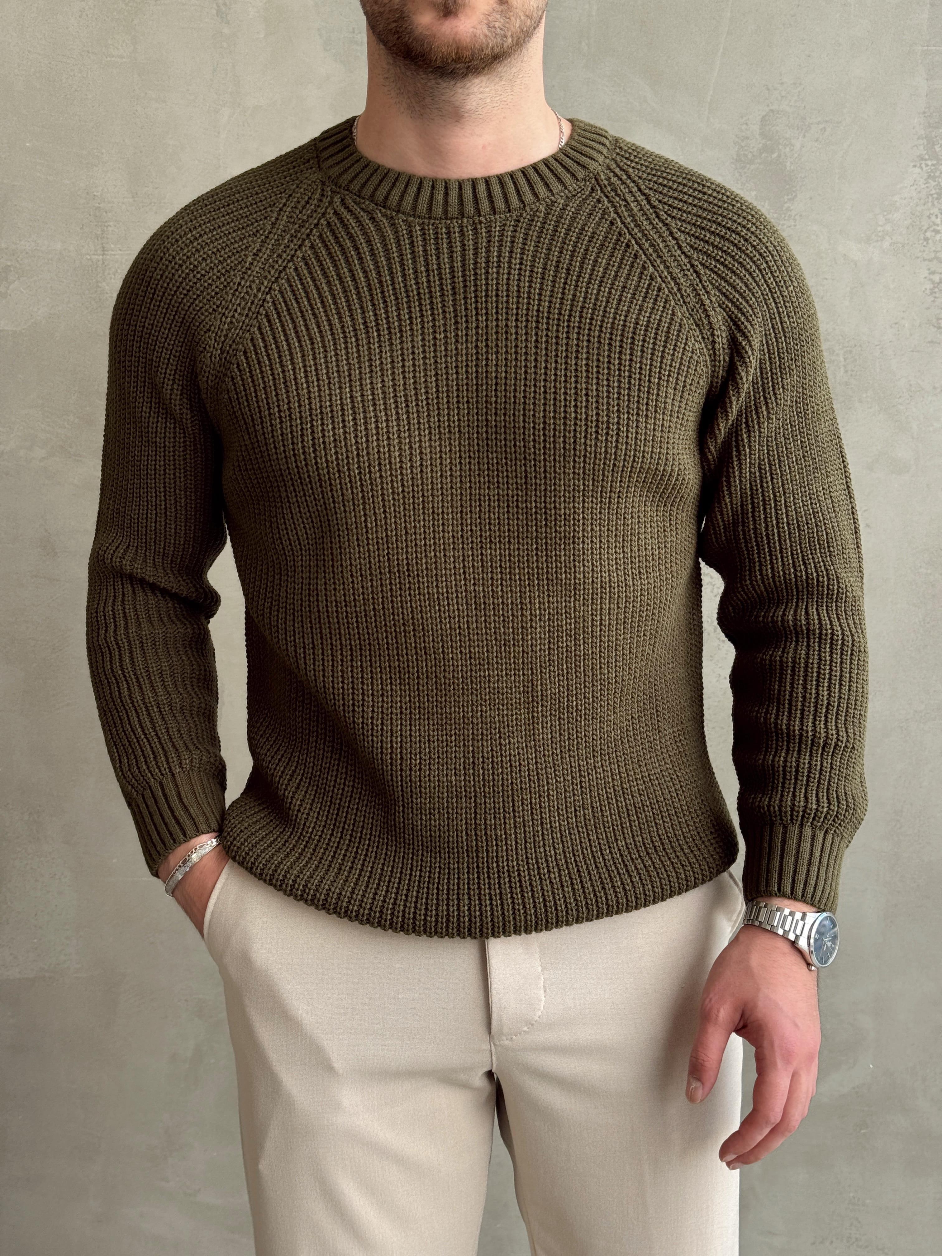 Erkek Geleneksel Tarz Oversize Kalıp Bisiklet Yaka Selanik Örmek Triko Kazak-Haki(E1471)Ketench