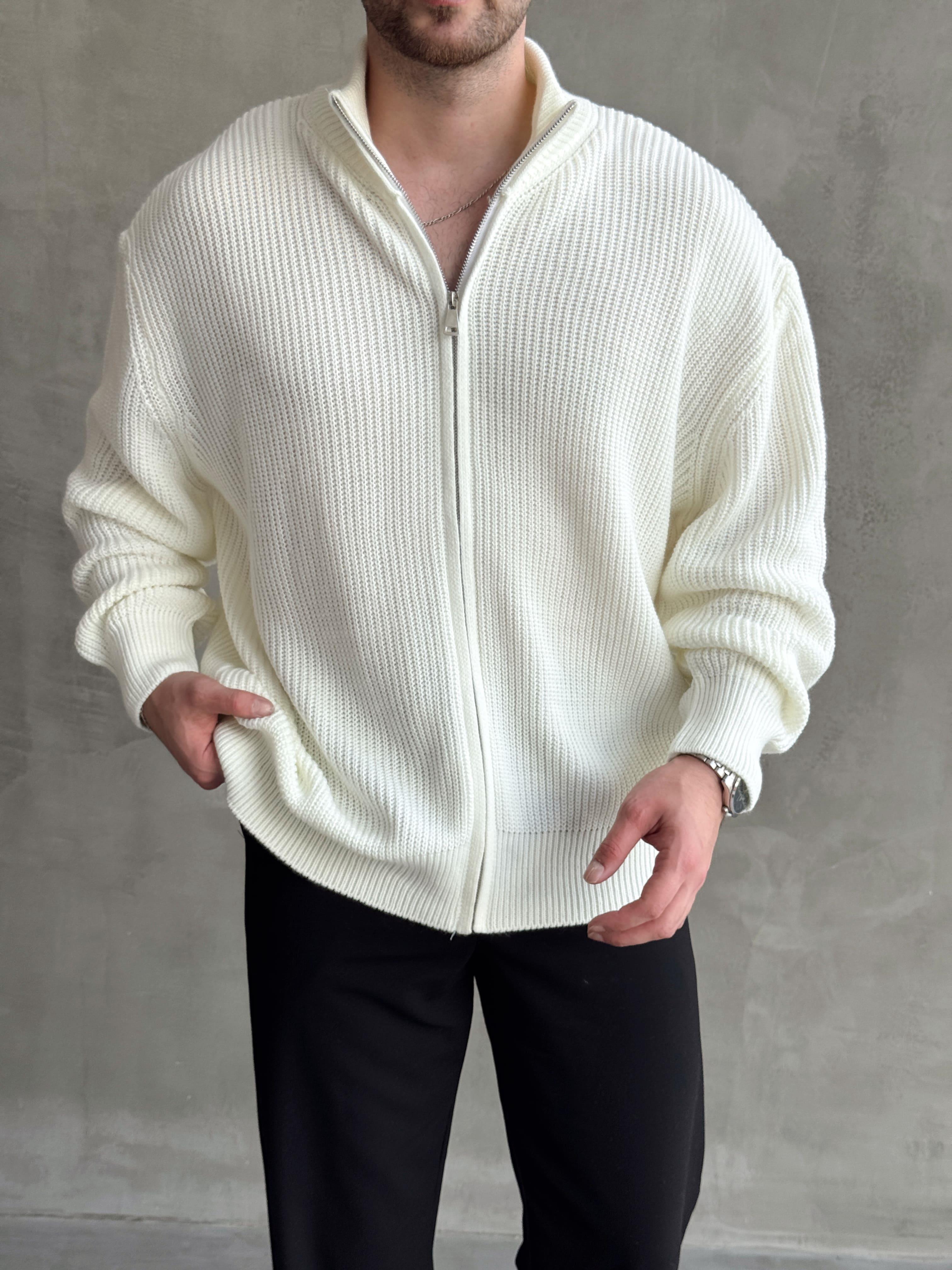 Erkek Geleneksel Tarz Oversize Kalıp Yarım Boğazlı Fermuar Detay Örme Triko Hırka-Ekru(E1470)
