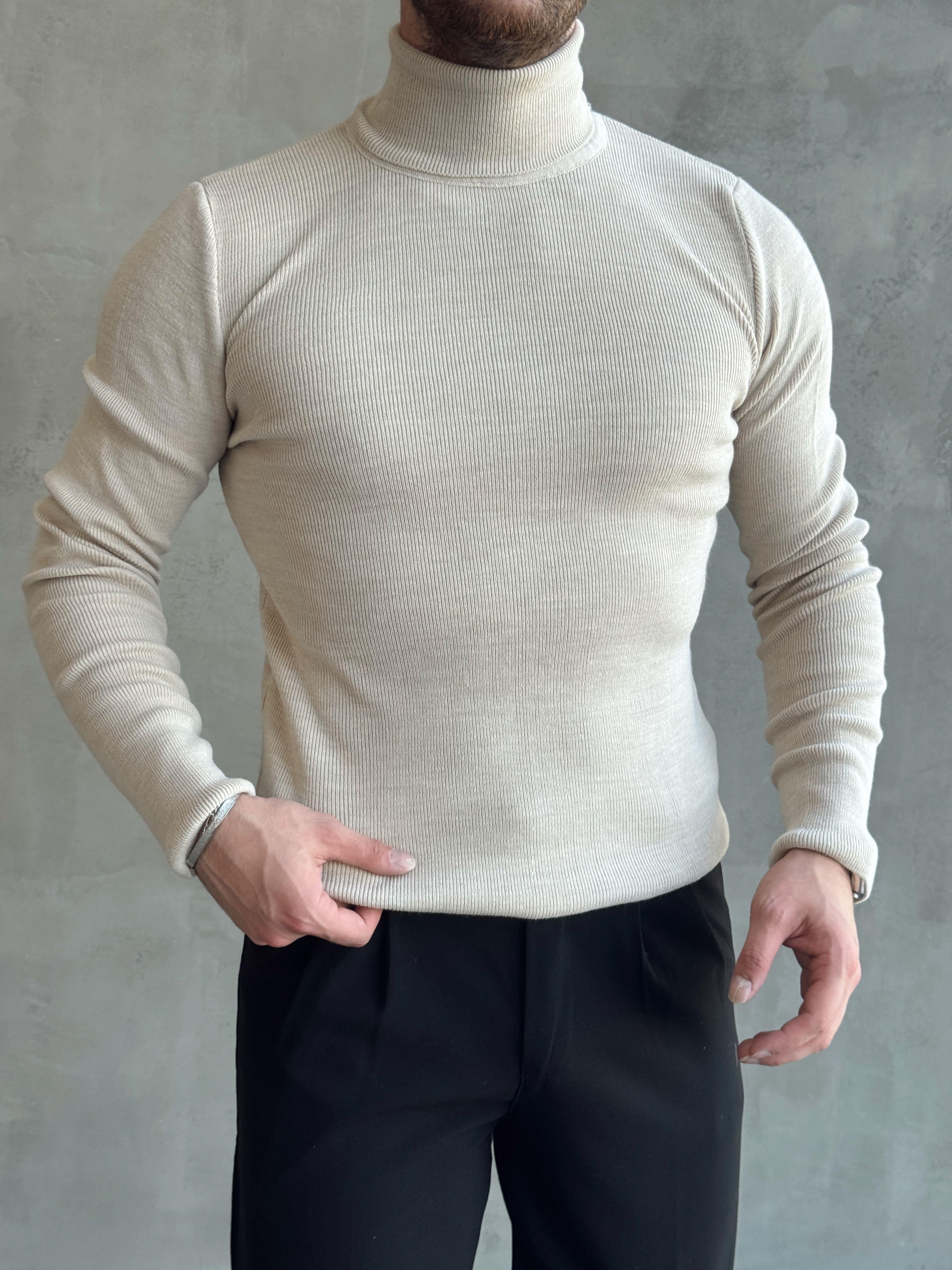 Erkek Minimalist Slim Fit Balıkçı Yaka Triko Kazak-Bej(E1488)