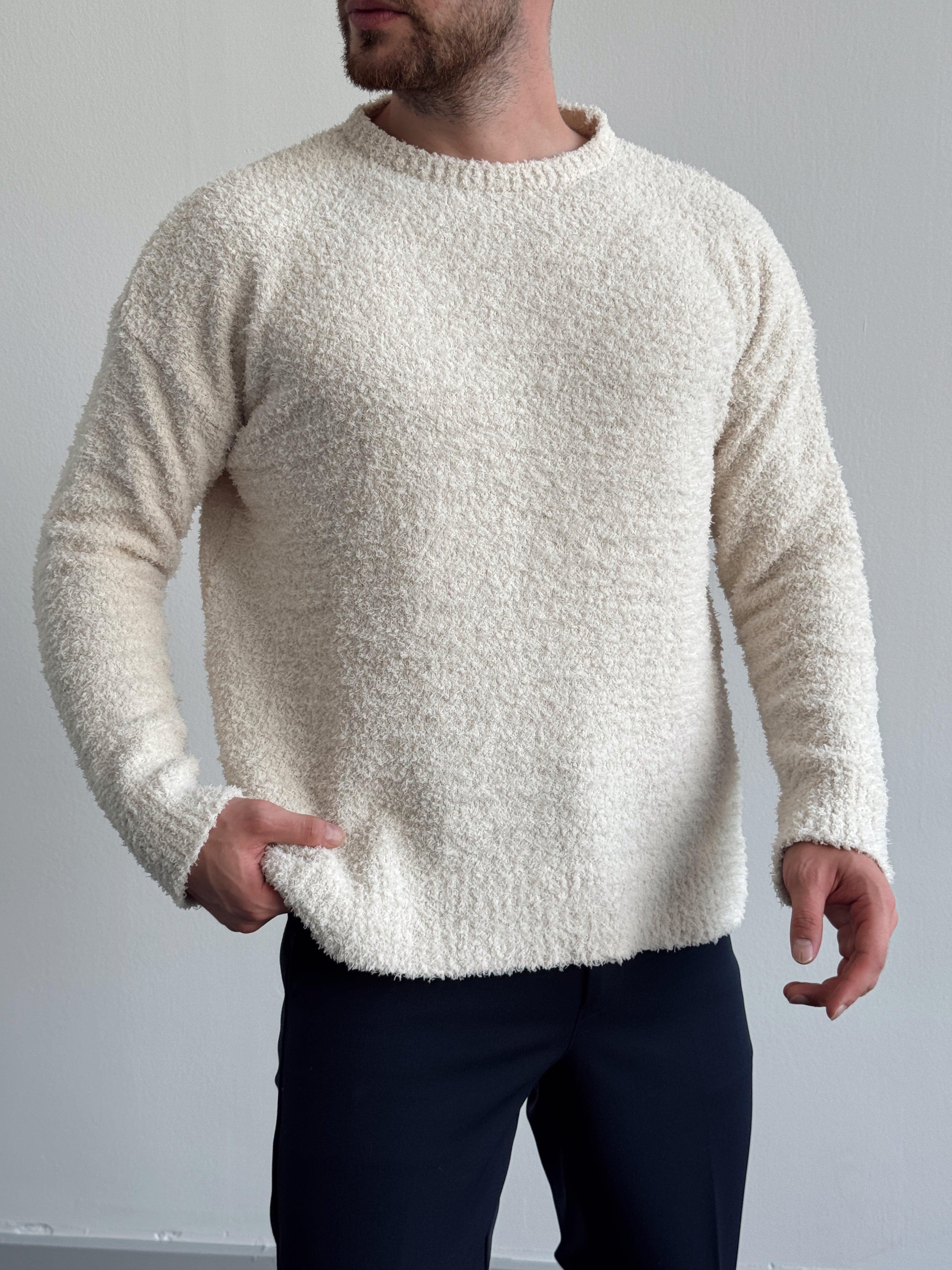 Erkek Oversize Bisiklet Yaka Plush Pullover Peluş Kazak-Ekru(E1143)