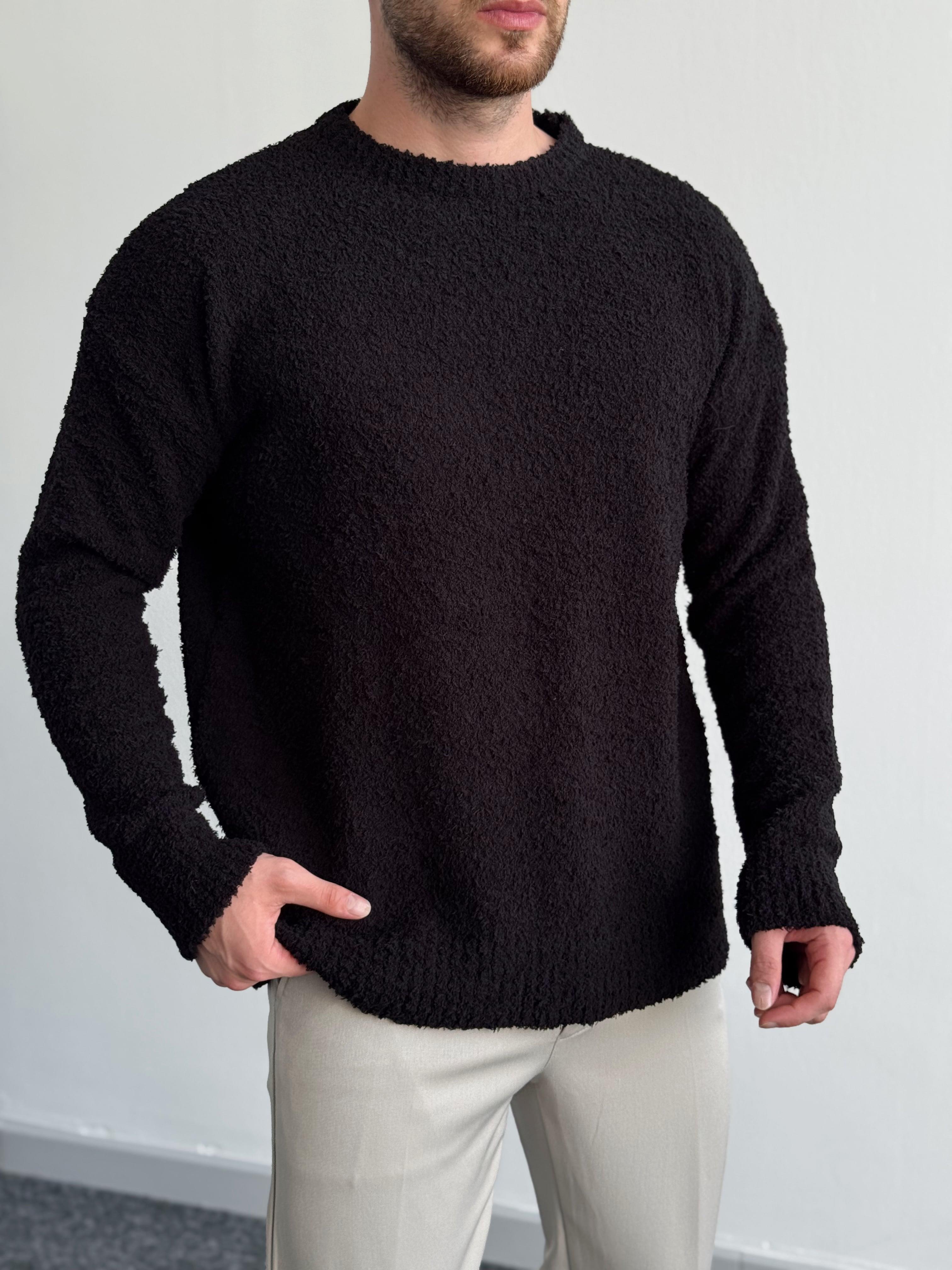 Erkek Oversize Bisiklet Yaka Plush Pullover Peluş Kazak-Siyah(E1143)
