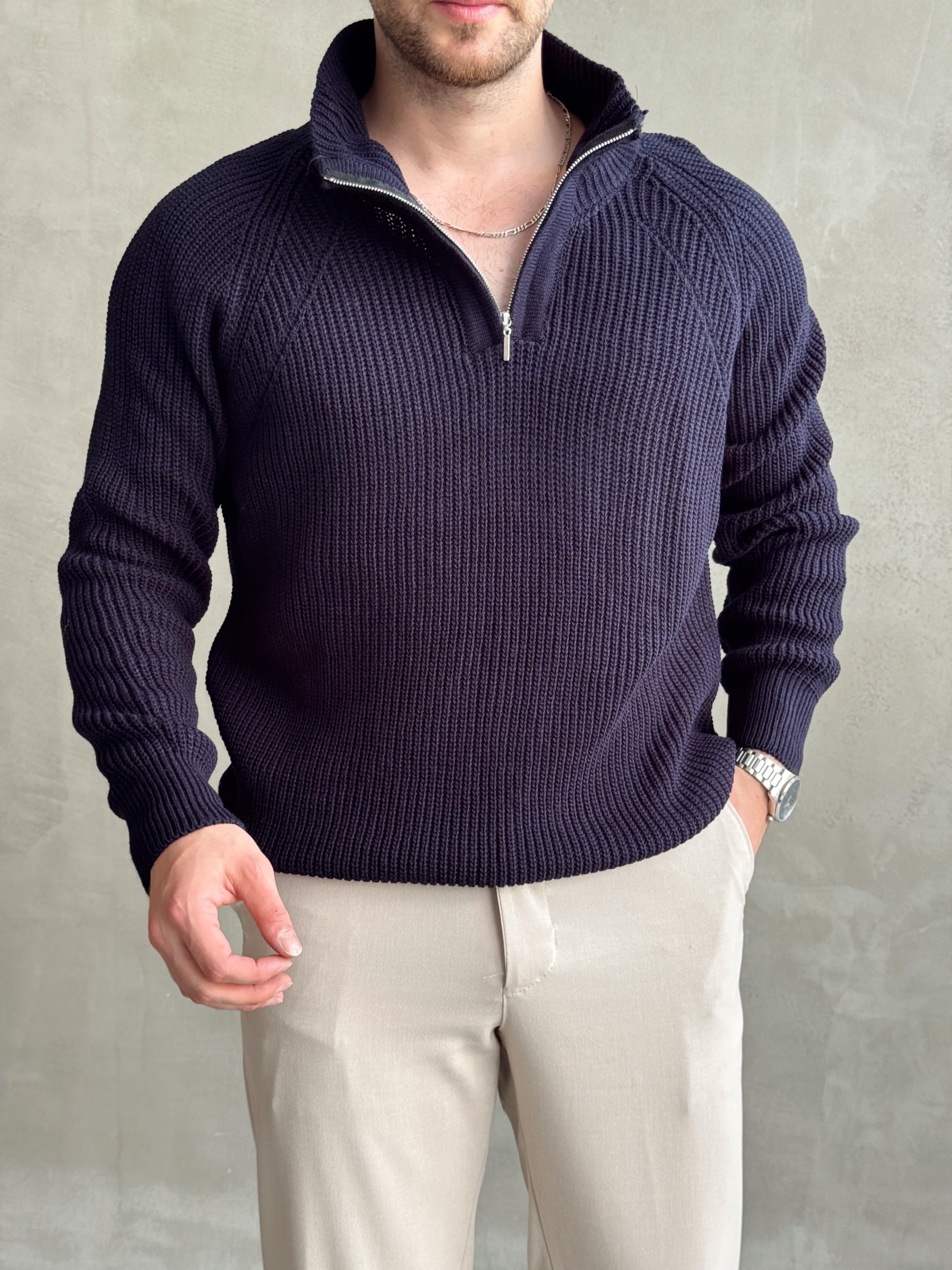 Erkek Oversize Yarım Fermuarlı Triko Kazak-Lacivert(E1115)