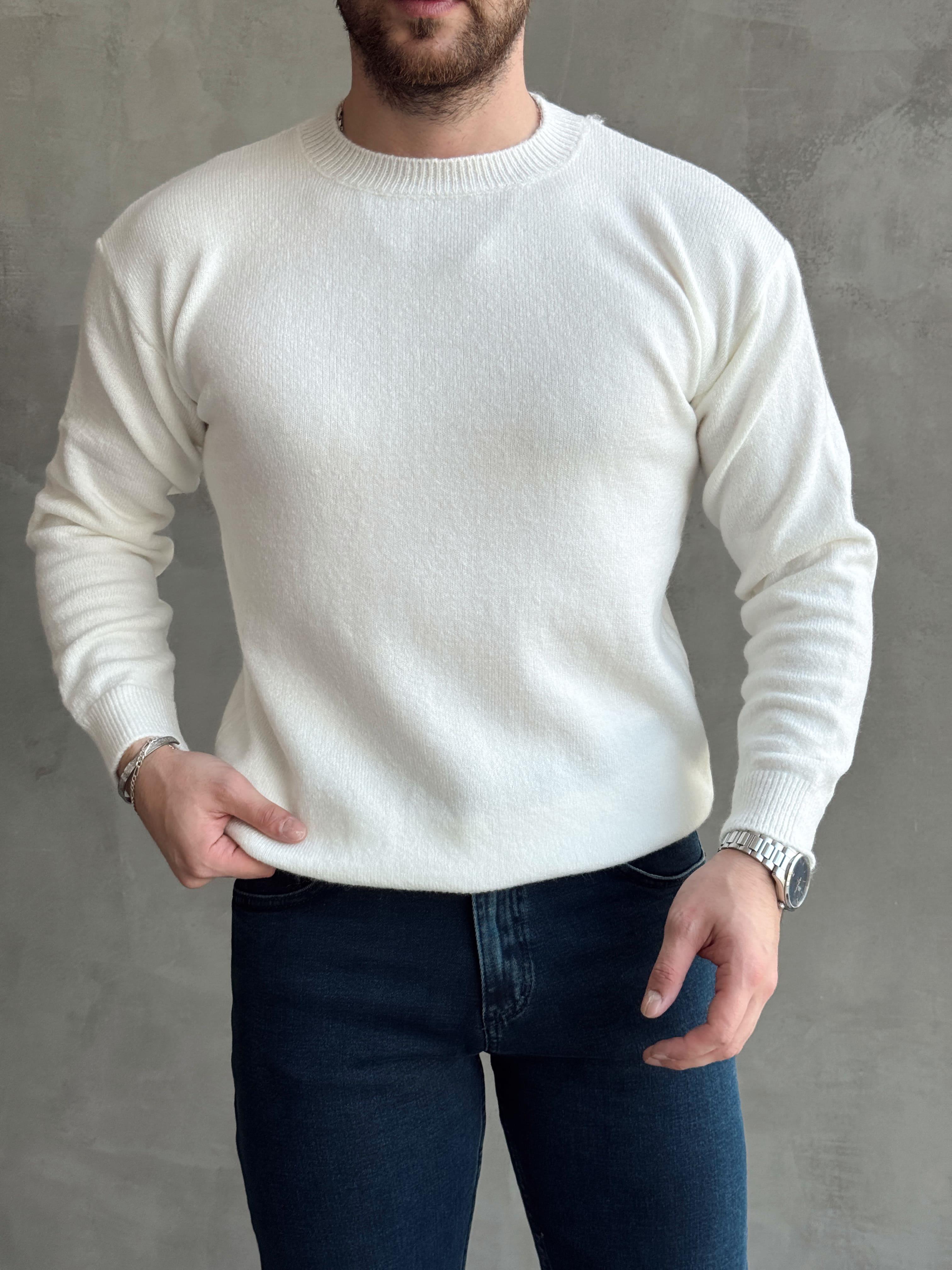 Erkek Premium Kalite Oversize Kalıp Bisiklet Yaka %50 Yün Karışımlı Yün Kazak-Beyaz(E1495)Ketench