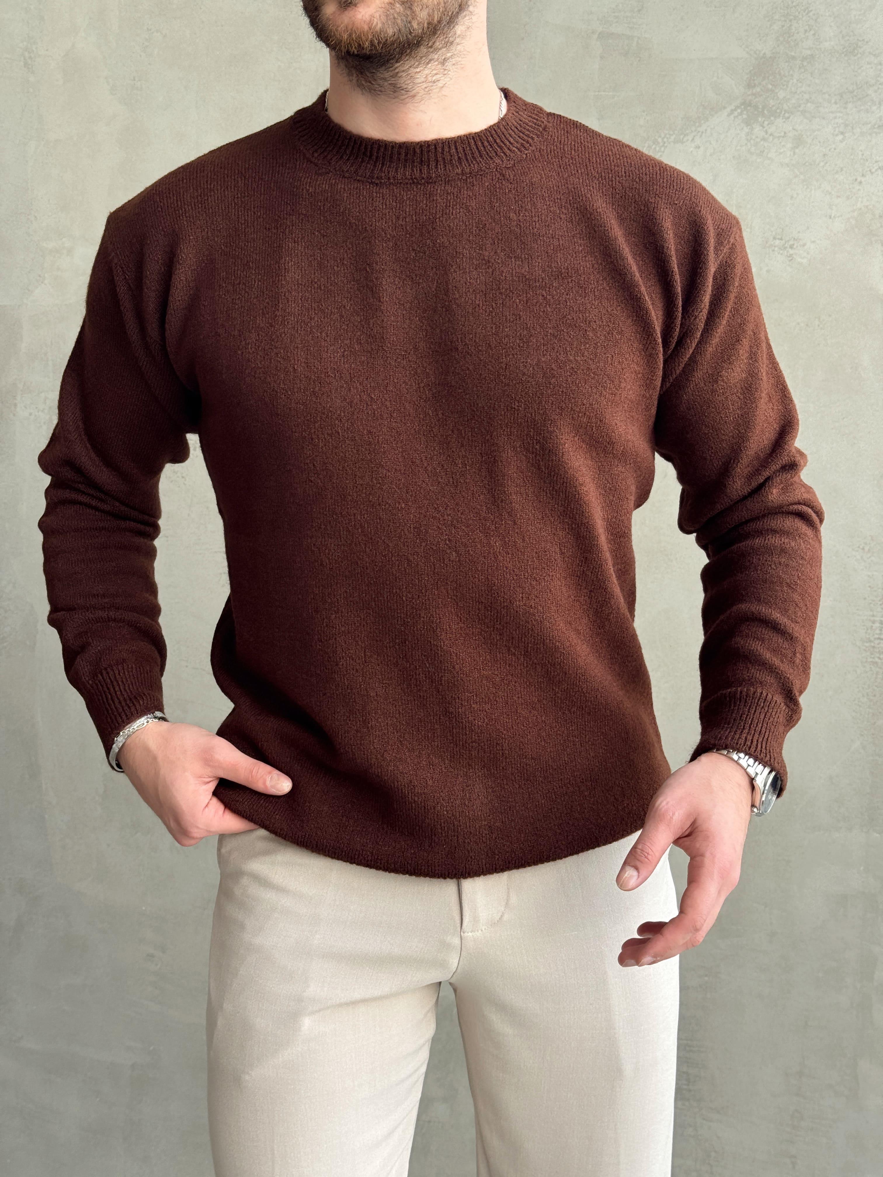 Erkek Premium Kalite Oversize Kalıp Bisiklet Yaka %50 Yün Karışımlı Yün Kazak-Kahverengi(E1495)
