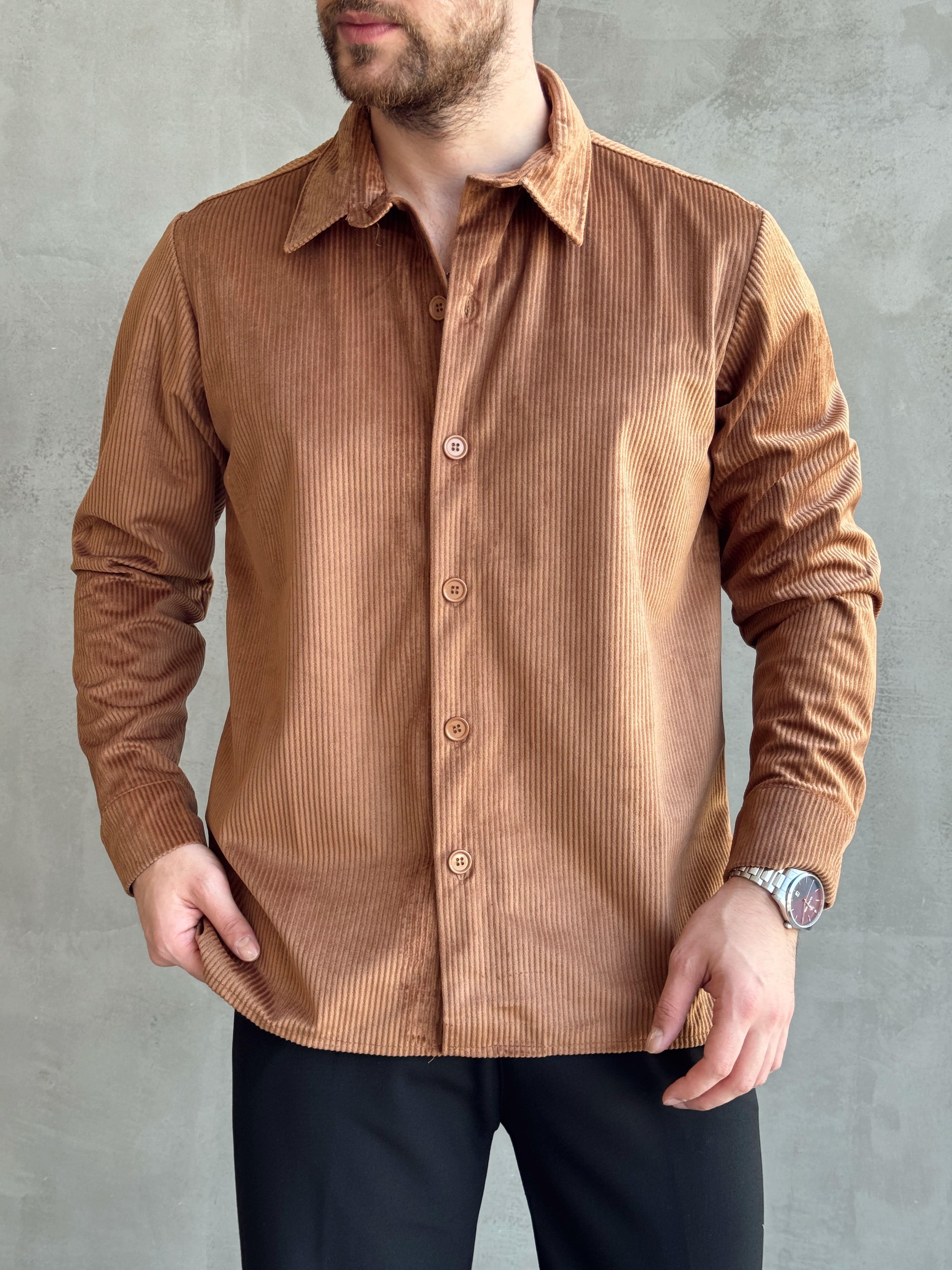Erkek Premium Kalite Oversize Kalıp Kışlık Kalın Kadife Gömlek-Taba(E1506)