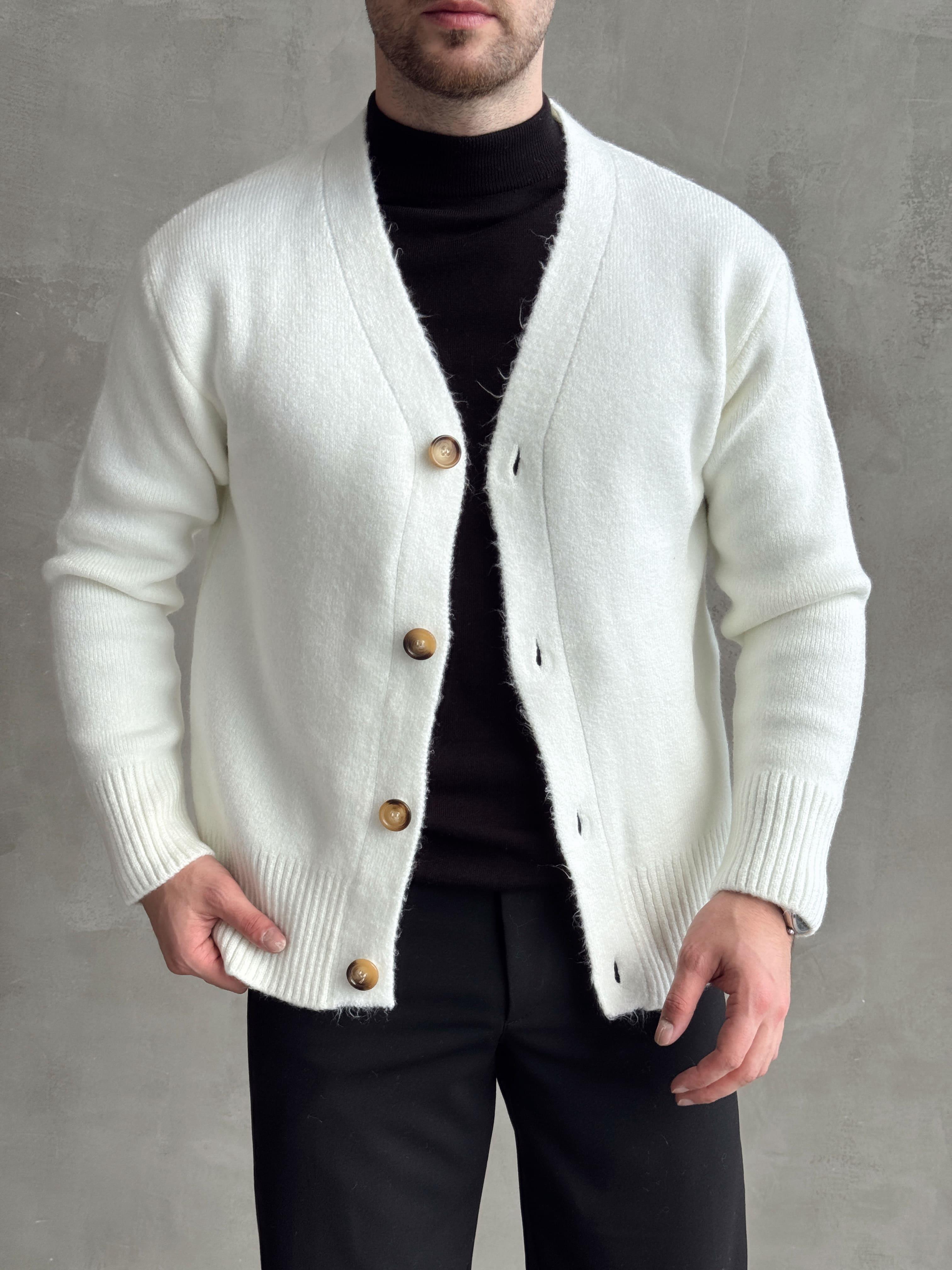 Erkek Premium Yüksek Kalite Oversize Kalıp Düğme Detaylı V Yaka Triko Hırka-Beyaz(E1479)