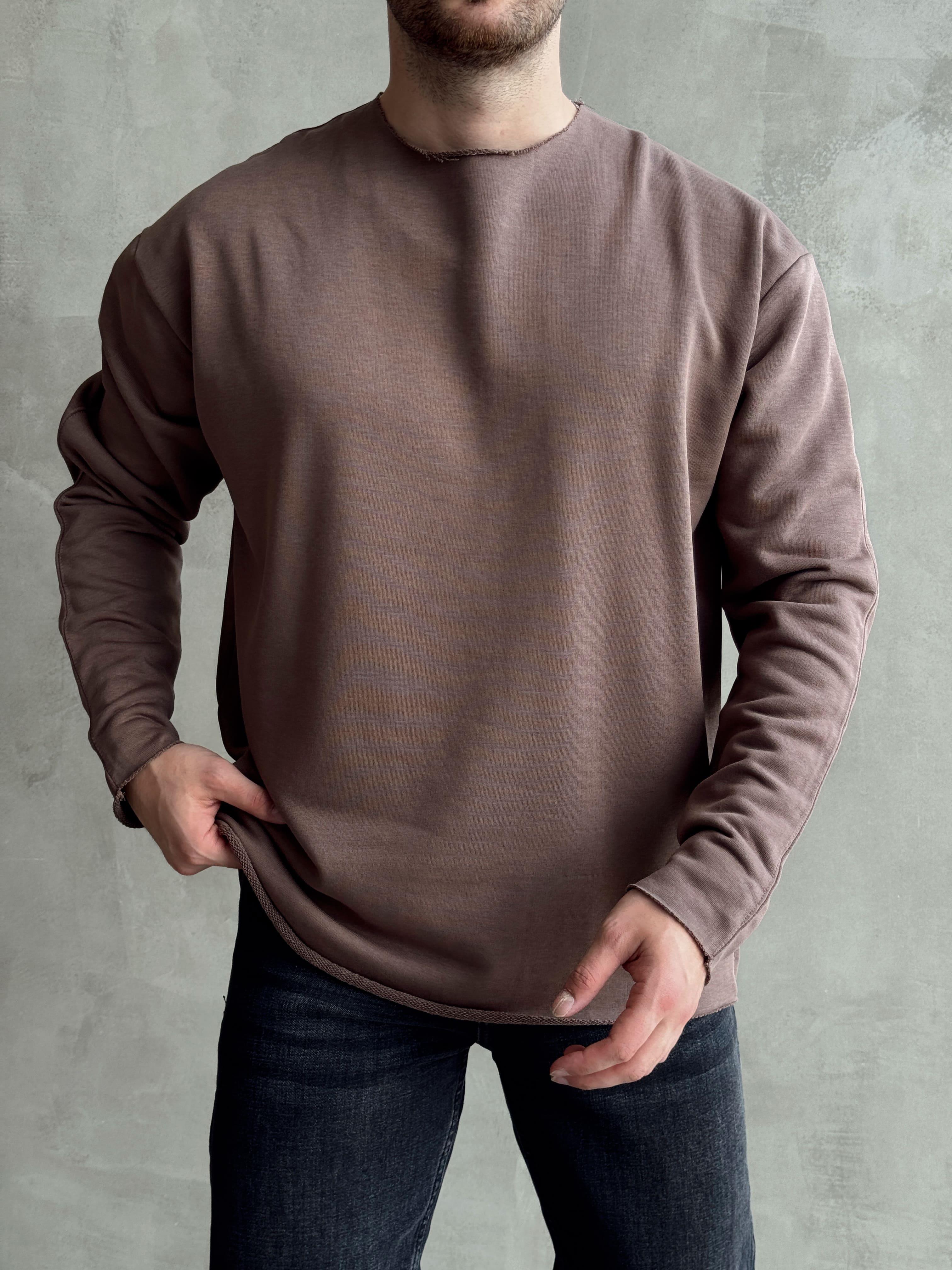 Erkek Premium Yüksek Kalite Oversize Kalıp Pis Kesim Bisiklet Yaka Sweat-Kahverengi(E1480)