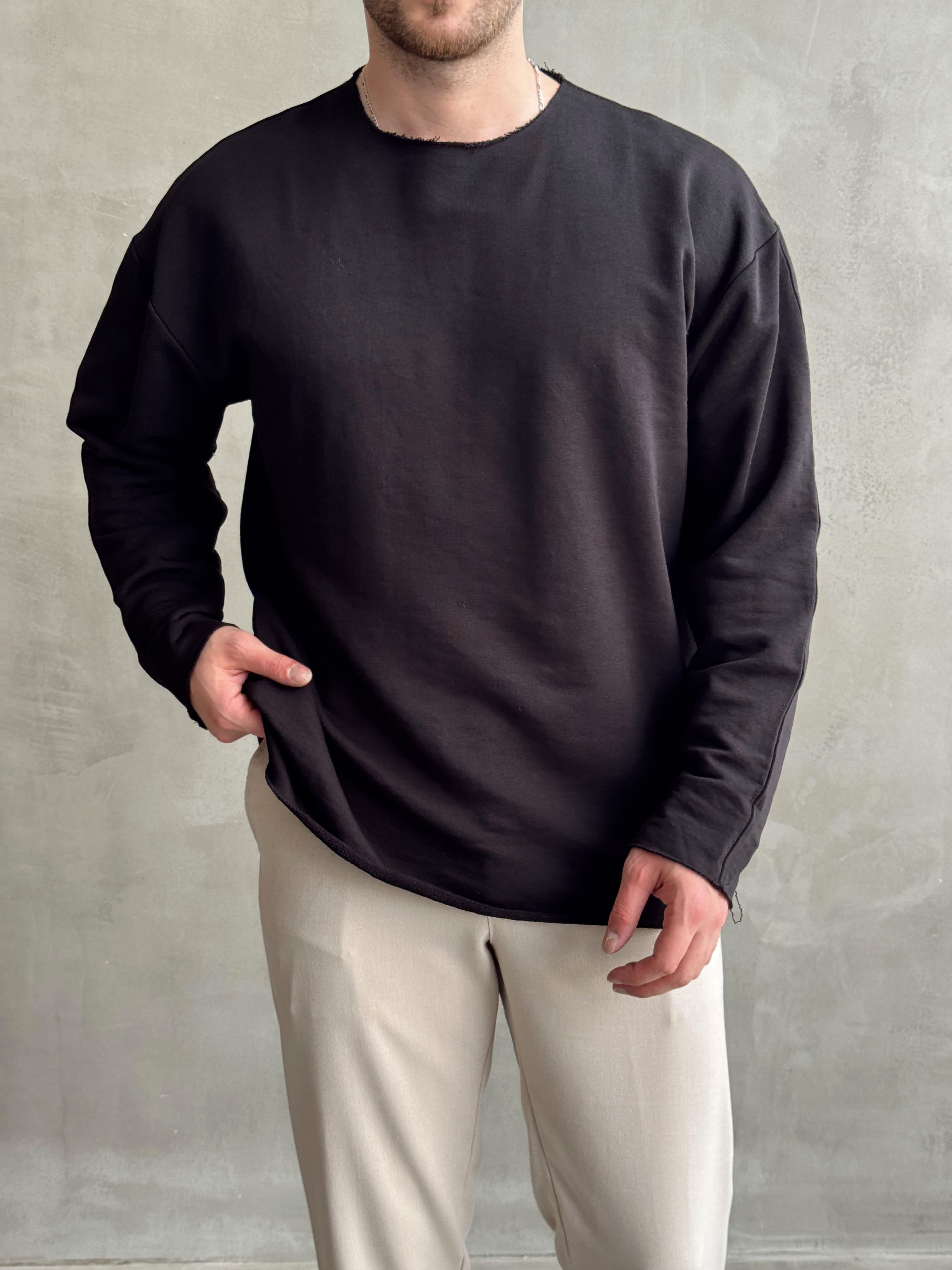 Erkek Premium Yüksek Kalite Oversize Kalıp Pis Kesim Bisiklet Yaka Sweat-Siyah(E1480)