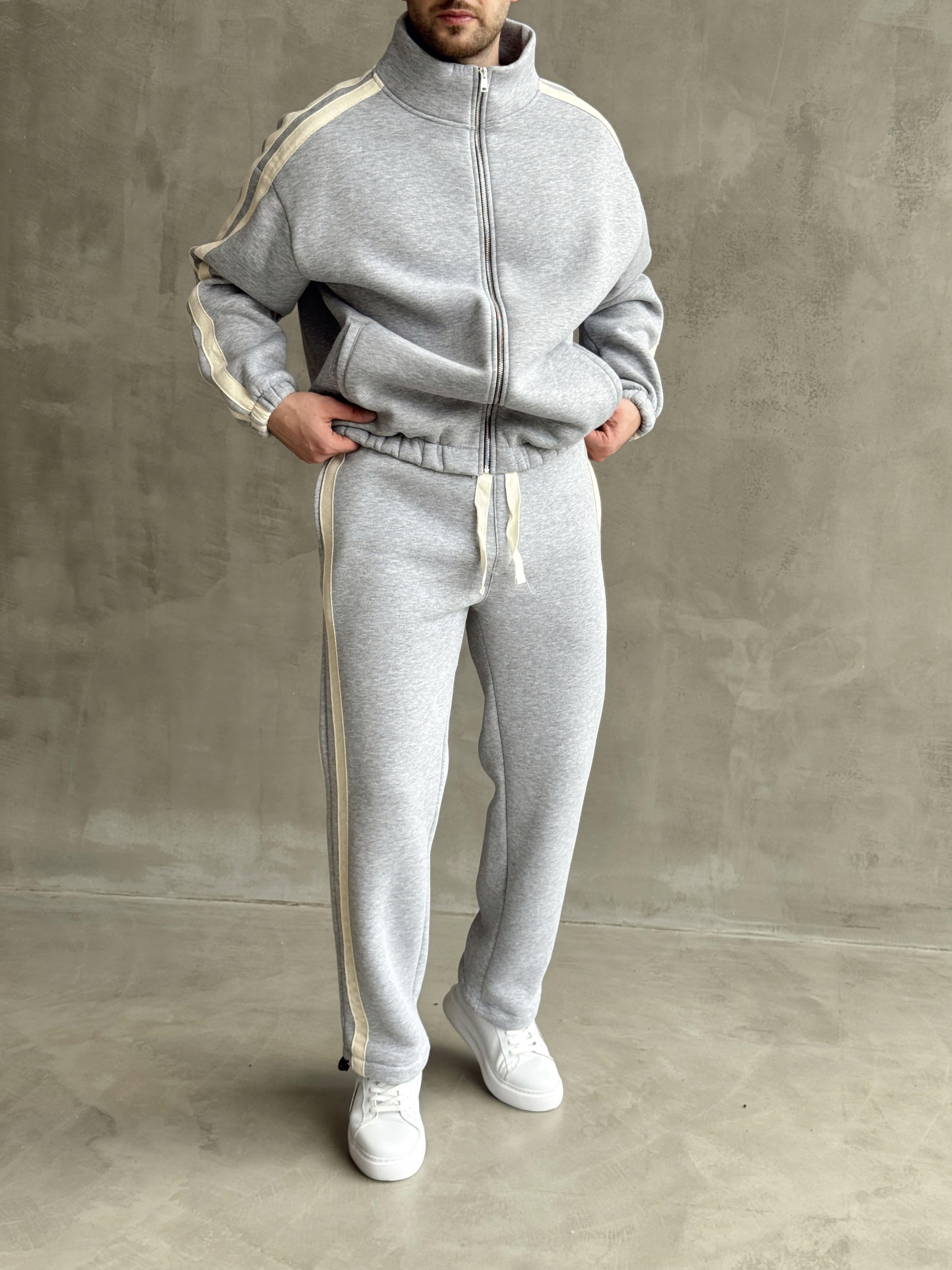 Erkek Premium Yüksek Kalite Oversize Kalıp Şardonlu Lastik Ribana 3 İplik Hasır Şerit Detaylı Sweat Eşofman Takım-Gri(E1476)