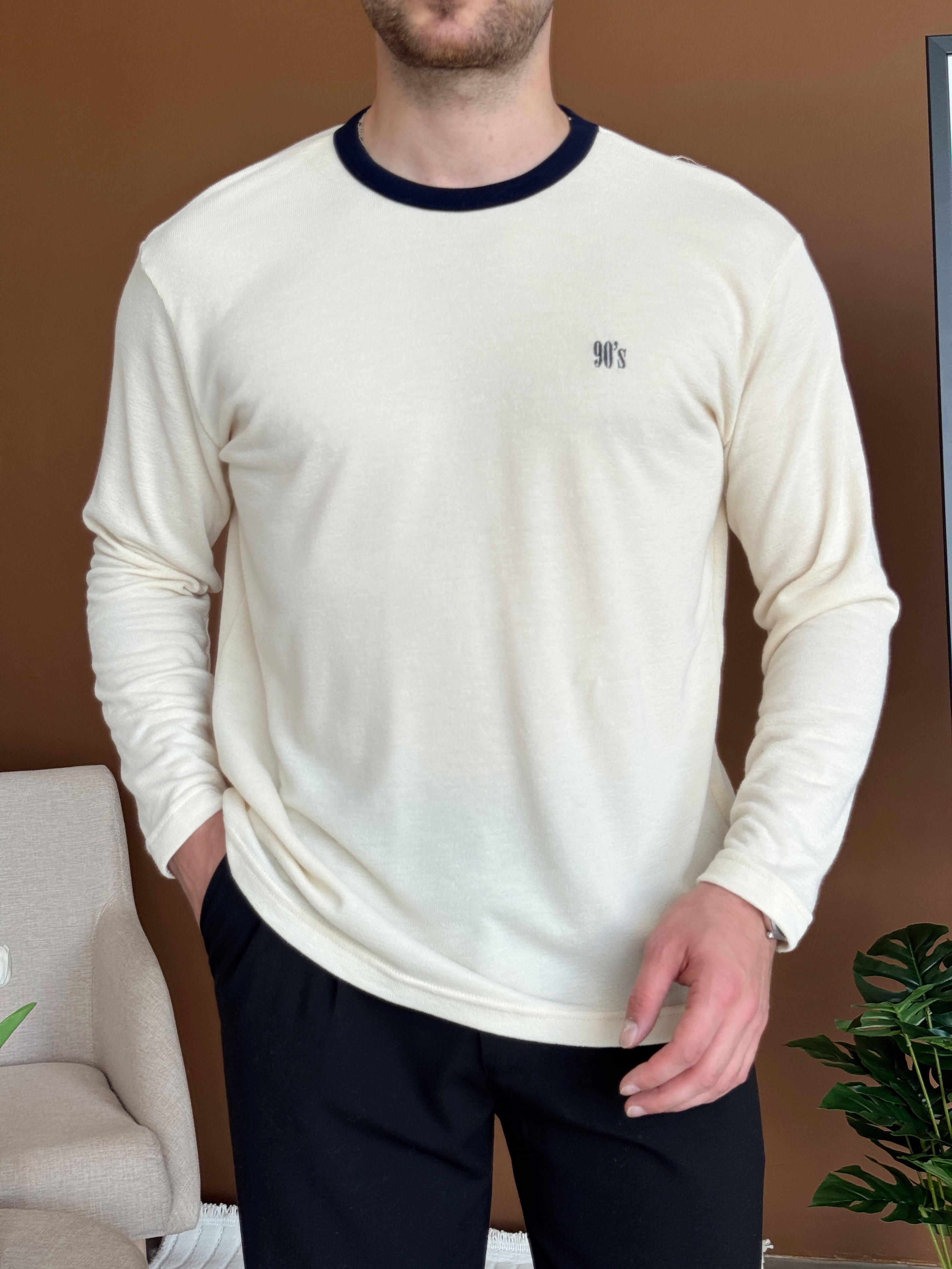 Erkek Premium Yüksek Kalite Regular Fit Bisiklet Yaka 90's İşleme Detay Triko Kazak-Krem(E1478)