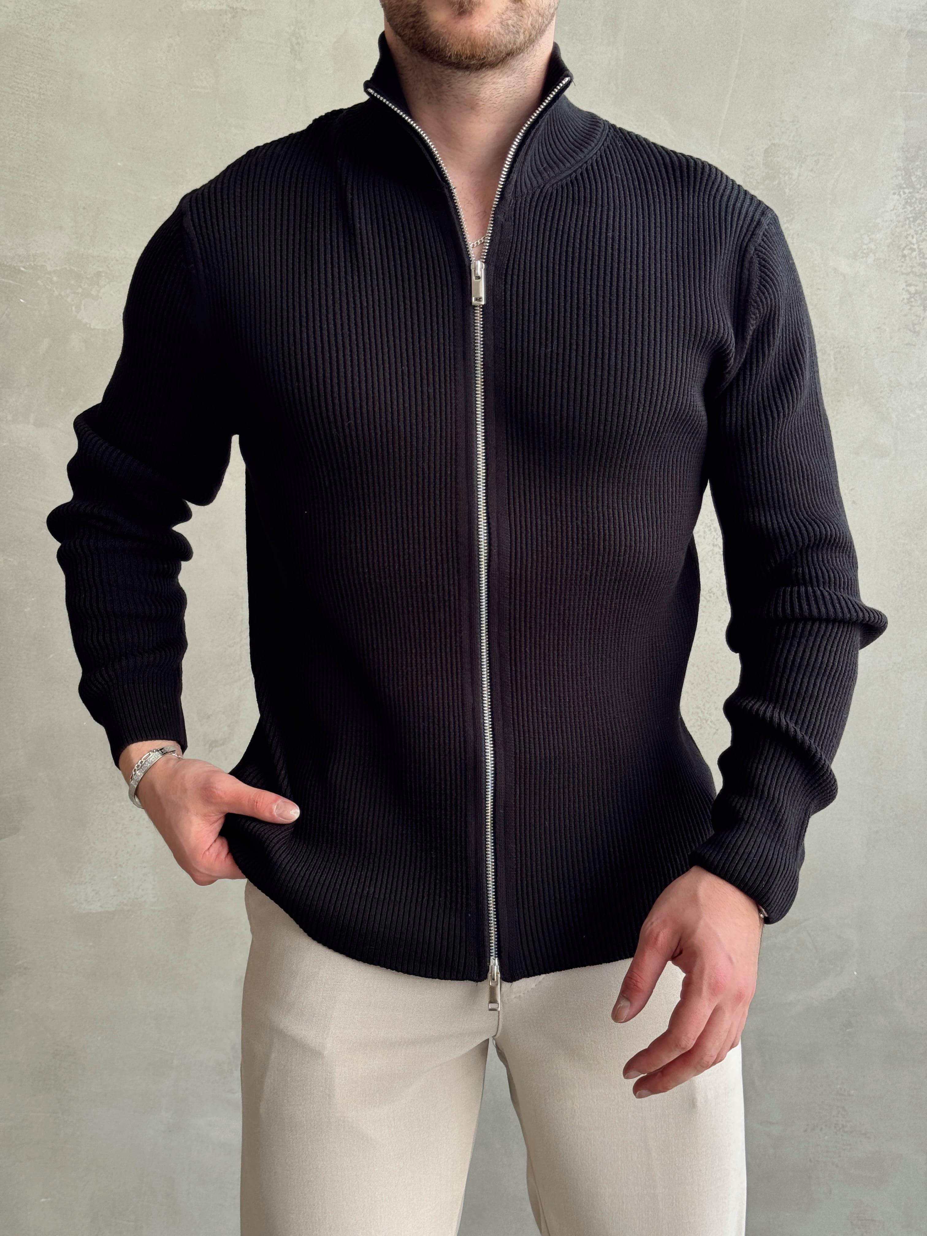 Erkek Premium Yüksek Kalite Regular Fit Fitilli Çift Fermuar Detay Triko Hırka-Siyah(E1481)