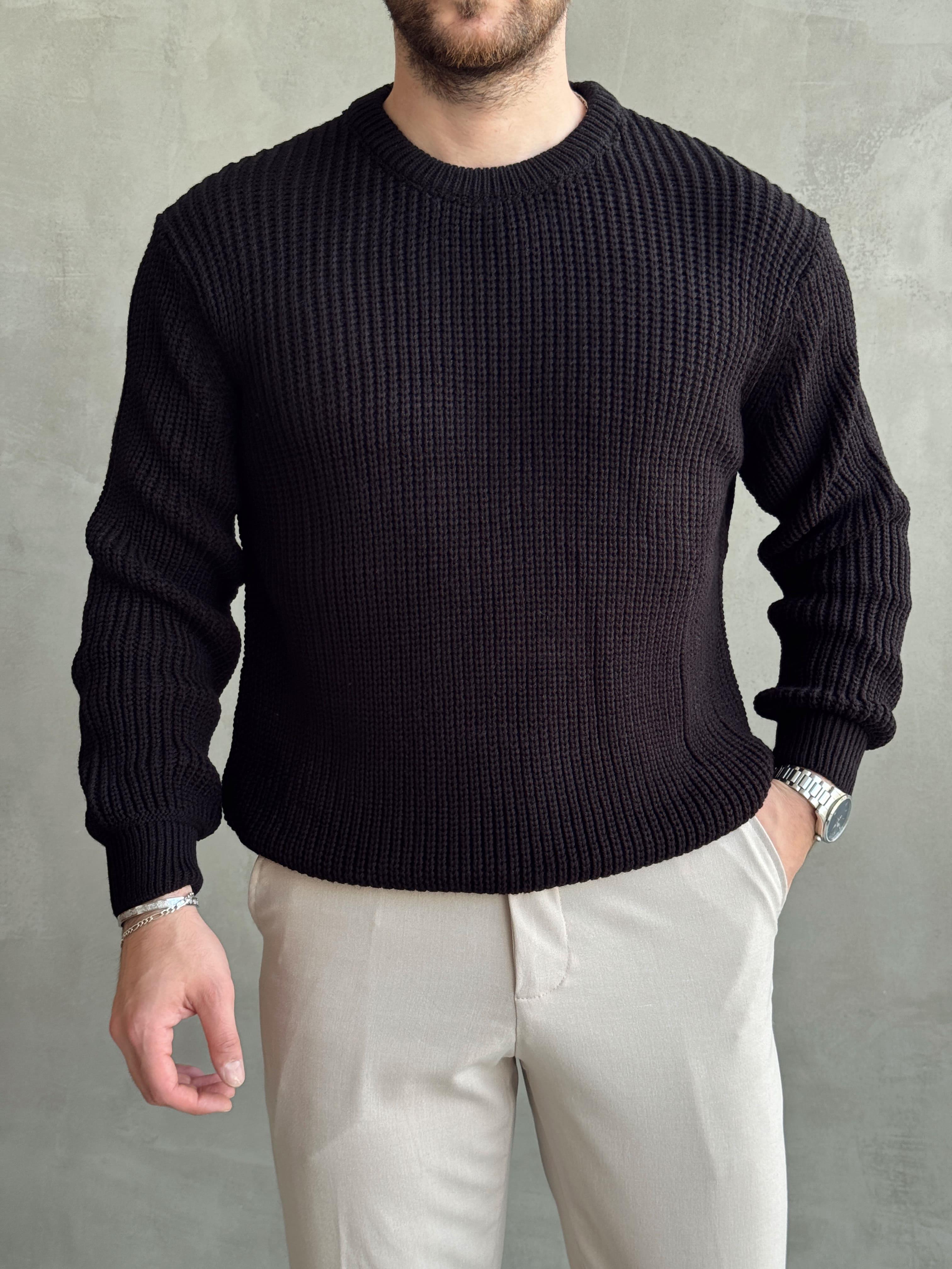 Erkek Yüksek Kalite Oversize Kalıp Bisiklet Yaka Selanik Örme Örgü Detaylı Triko Kazak-Siyah(E1496)