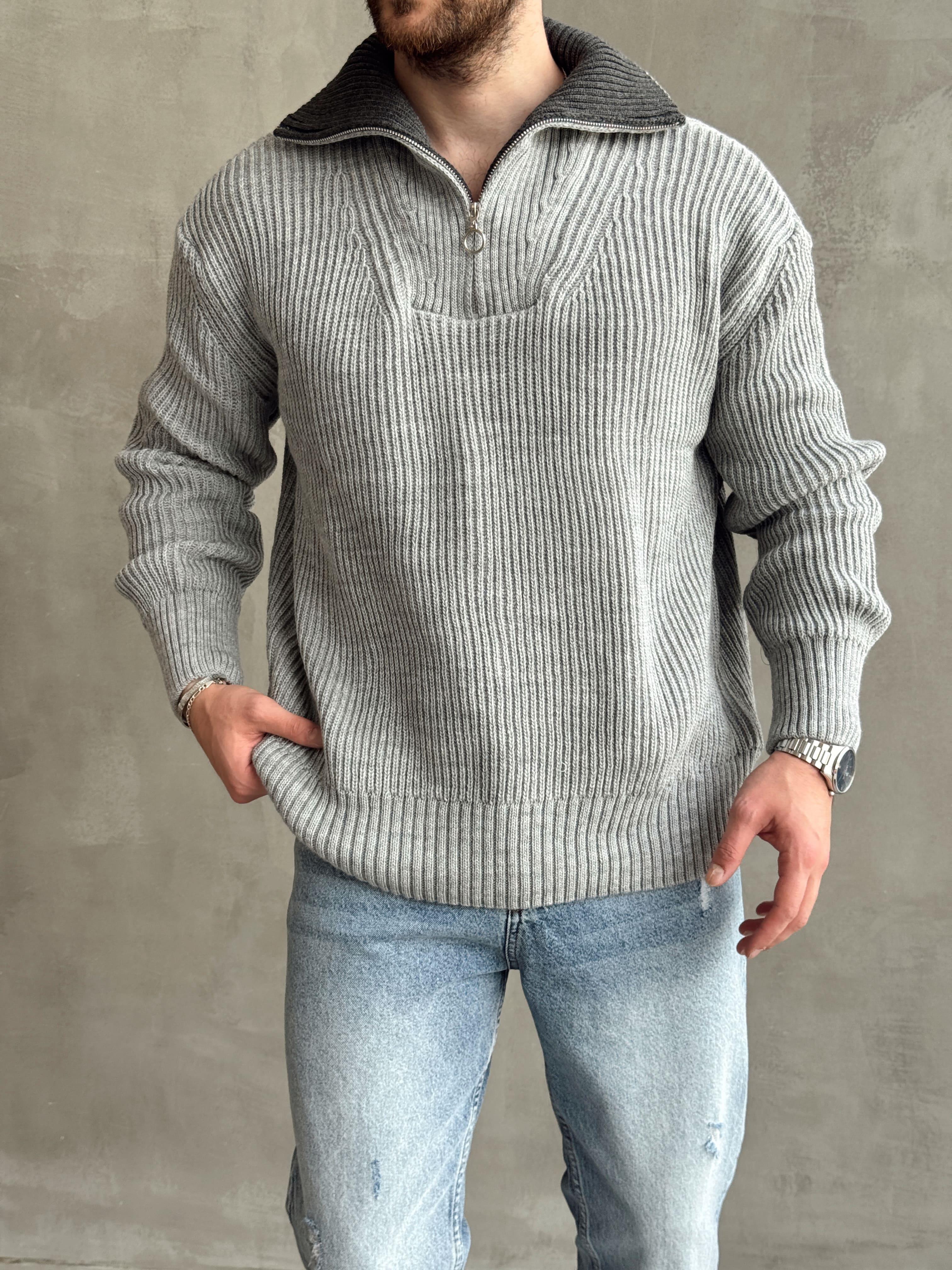 Erkek Yüksek Kalite Yarım Fermuarlı Dik Yaka Oversize Triko Kazak-Gri(E1210)